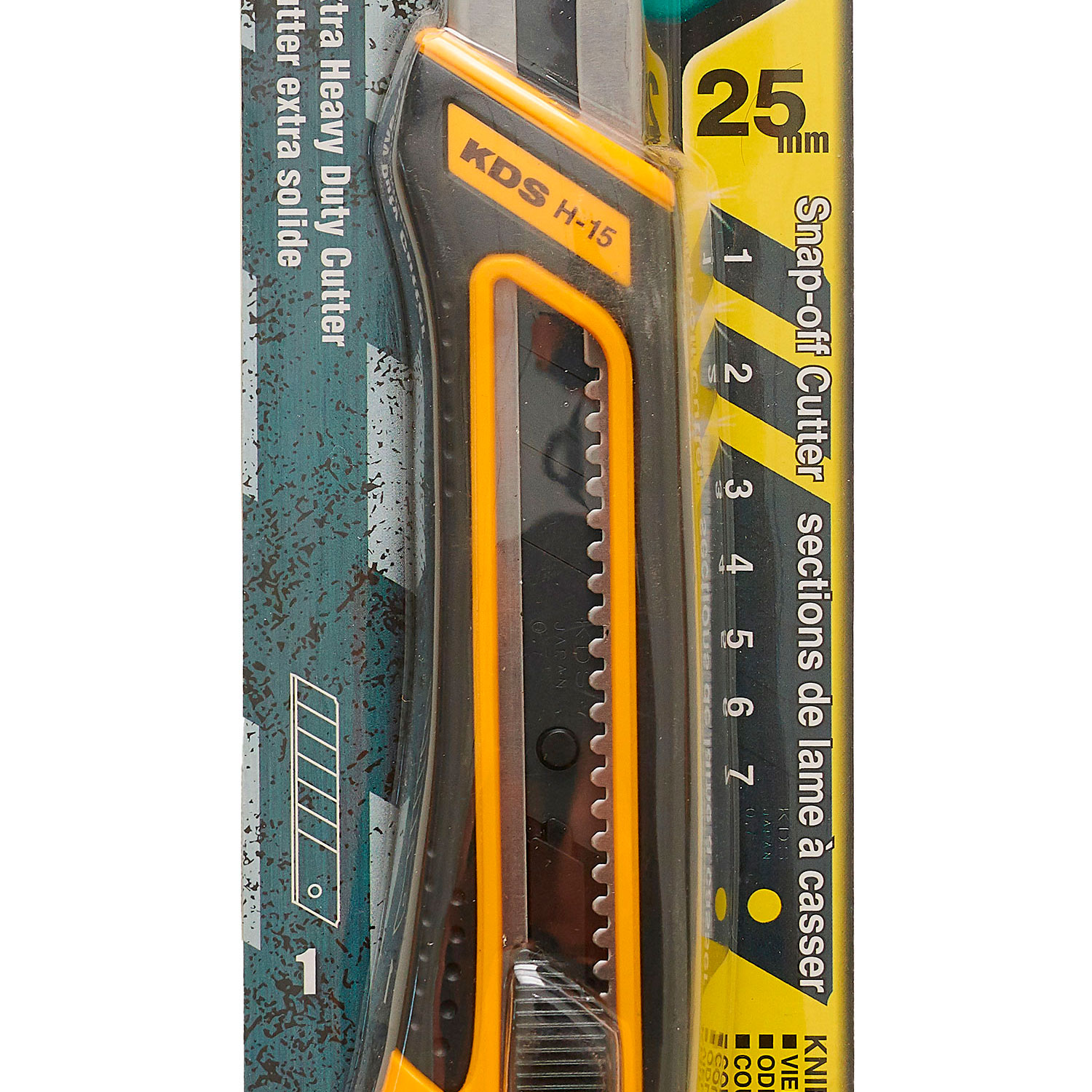 Cutter KDS H-15, ideal para trabajos de precisión y uso intensivo, con un sistema de auto-lock que proporciona mayor seguridad durante su uso. Cuenta con un grip de goma para mayor comodidad y control, lo que lo hace ideal para usuarios que requieren un manejo prolongado. Su hoja de 25mm x 0.7mm extra fuerte garantiza cortes precisos y duraderos, incluso en materiales más resistentes. Además, su gran empuñadura ergonómica proporciona una excelente sujeción y reduce el esfuerzo durante el uso.