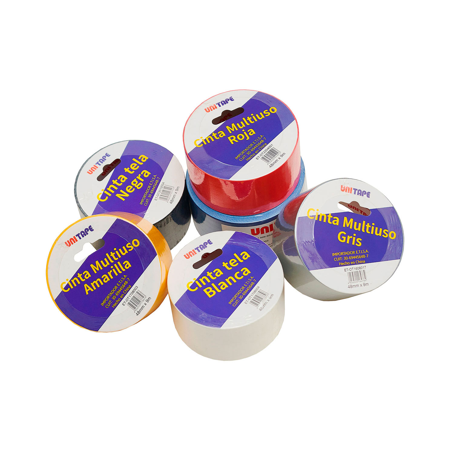 Disponible en colores gris, amarillo, blanco, negro y azul, en formato de 48 mm de ancho por 9 metros de largo.